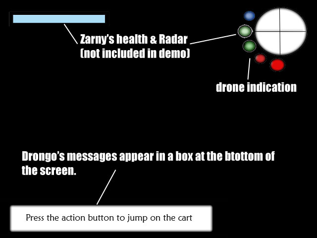 - The user can control the character of Zarny, using the arrow keys (Up, Down, Left and Right) for movement and the left mouse button for clicking on objects (e.g. medical kits). - Drongo is a wrist-based super computer that Zarny wears, which allows him to communicate with the outside world. Unfortunatly however, if used too often the enemy will pick up the signal and hunt him down.